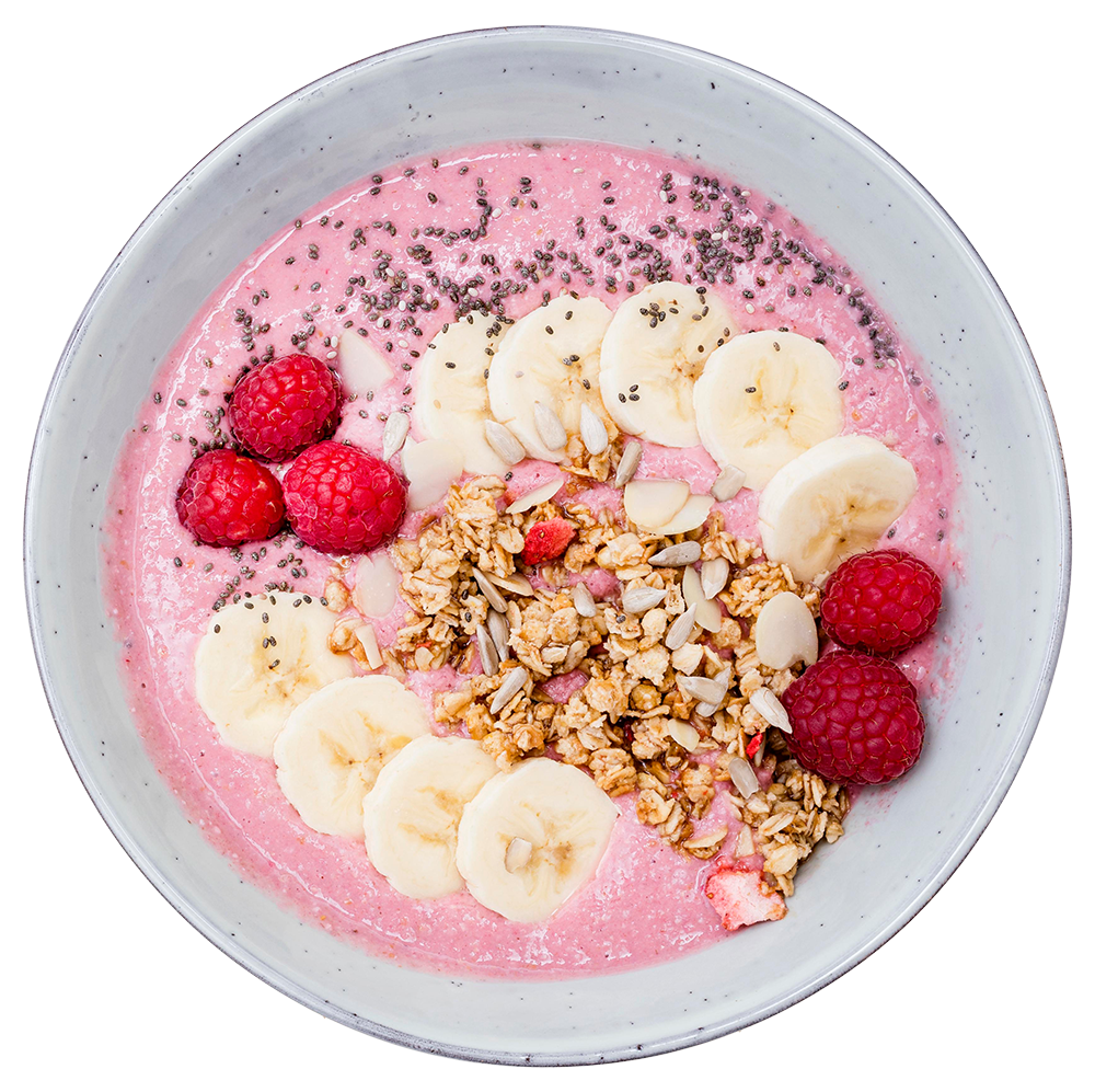 Hias dengan irisan pisang, granola, raspberry, chia seed, dan biji bunga matahari. Bisa ditambah almond slice untuk tekstur renyah.