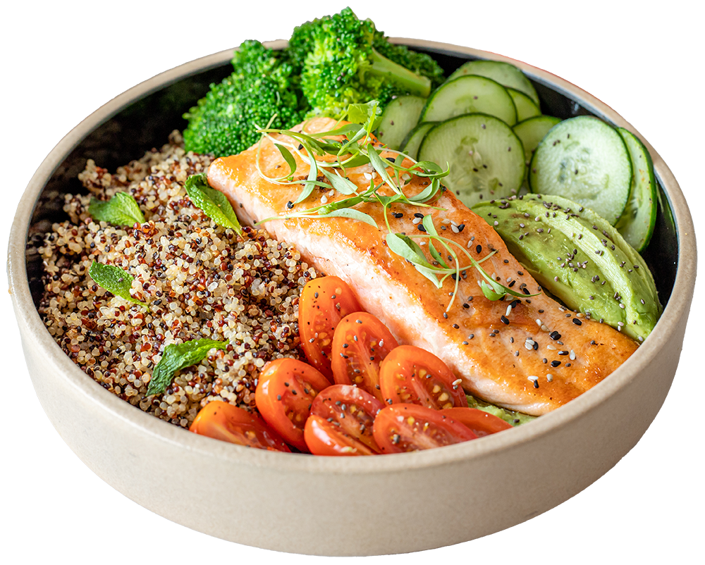 Dalam mangkuk besar, tata quinoa sebagai dasar. Tambahkan salmon panggang, alpukat, brokoli, timun, dan tomat. Taburi dengan biji wijen dan microgreens/daun mint.